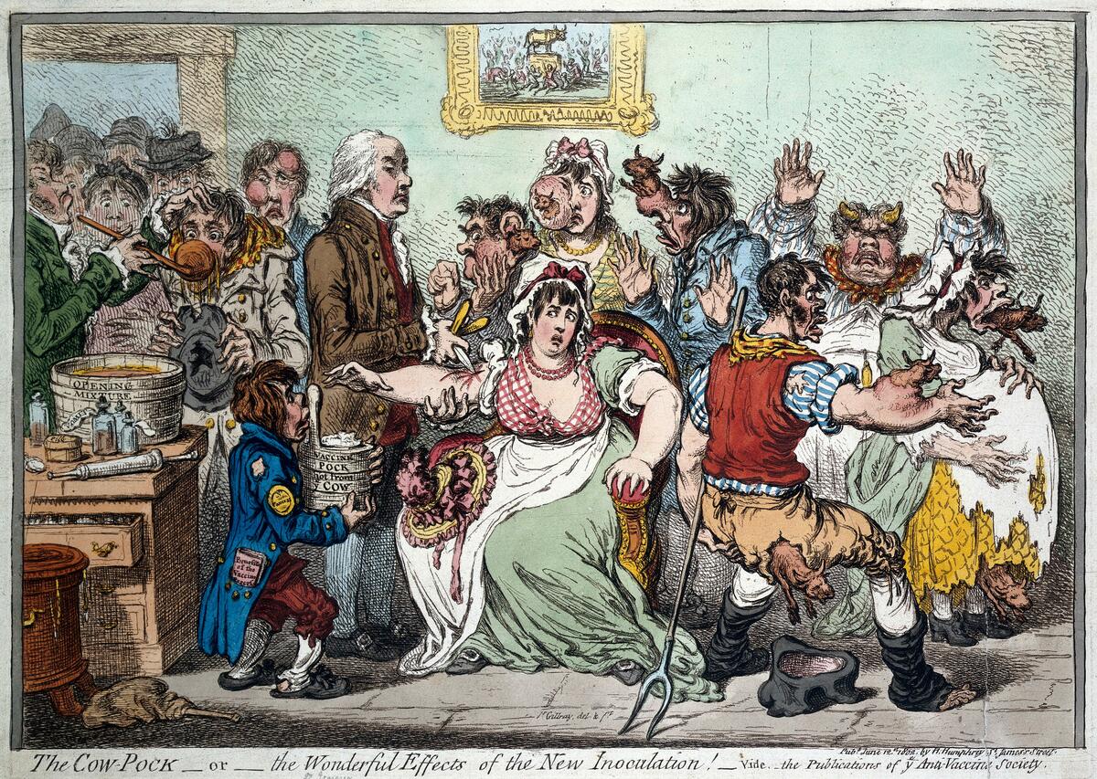 Mistænksomhed over for vacciners skadelige virkninger kan spores tilbage til de første vaccinationsforsøg mod koppevirus. Karikaturtegningen fra 1801 viser nogle af de forestillinger, som vaccinationen med kokopper kunne give anledning til, bl.a. vansiring og dyrelignende gevækster hos de vaccinerede.