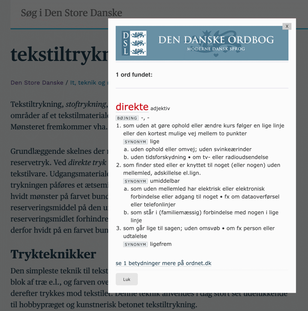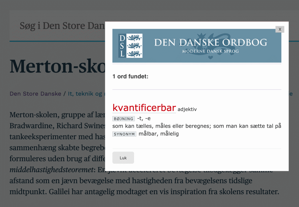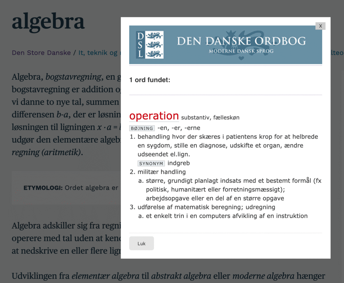 Vi tilbyder derfor, at man kan dobbeltklikke på et hvilket som helst ord i en artikel og få det forklaret, hvis det findes i Den Danske Ordbog. Når man klikker på et ord, vises der en kortfattet version af ordforklaringen fra Den Danske Ordbog fra Det Danske Sprog- og Litteraturselskab.
